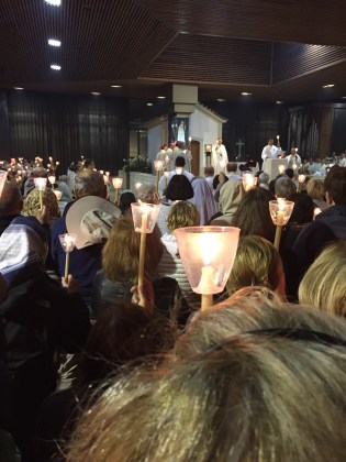 I had wondered how this tightly packed crowd with all these lit candle were ever going to get turned around and start a procession. But quietly and gently that’s exactly what happened. Everyone walked in complete silence. The music from the church continued and the praying over the loudspeaker continued. But no one in the crowd spoke a word. I think everyone was kind of in the zone too.