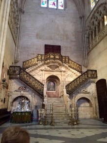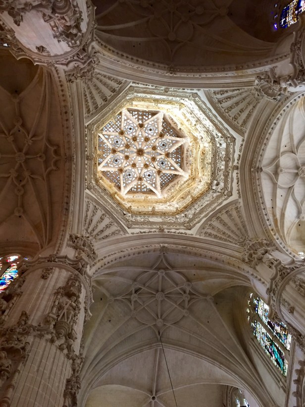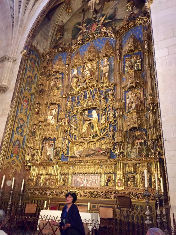 We got into Burgos too late for our scheduled mass in one of the chapels at the Cathedral. That was ok by me because we were all just so darn tired. We had been in that bus for like 7hrs. Instead of cutting the Mass from our schedule, they rescheduled it for super early the next morning. Their new plan was to go to Mass then come back to the hotel for breakfast, then start our day. Ugh, That was way to much form me. I felt like my rheumatoid arthritis has hit its limit. I started taking prednisone a few days ago and can literally not walk even a few minutes without the cane. There are just so many steps in these old towns and then there are those cobblestone streets. I’m so afraid I’m going to fall. My ankles and my shins are killing me. It feels like the tendons are seizing up. I think it’s the uneven sidewalks, walking up and down hills and all those steps. I’m lucky because both my cousins quietly keep an eye on me. Just when I get to the some high uneven medieval steps, I feel a hand on my elbow steadying me. Sometimes I feel like saying ..no no I can do this myself. But then just tonight I was going up some curving steps and started to stumble. If it wasn’t for Carolyn holding onto me, I know I would have fallen.