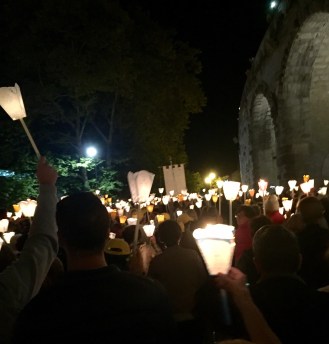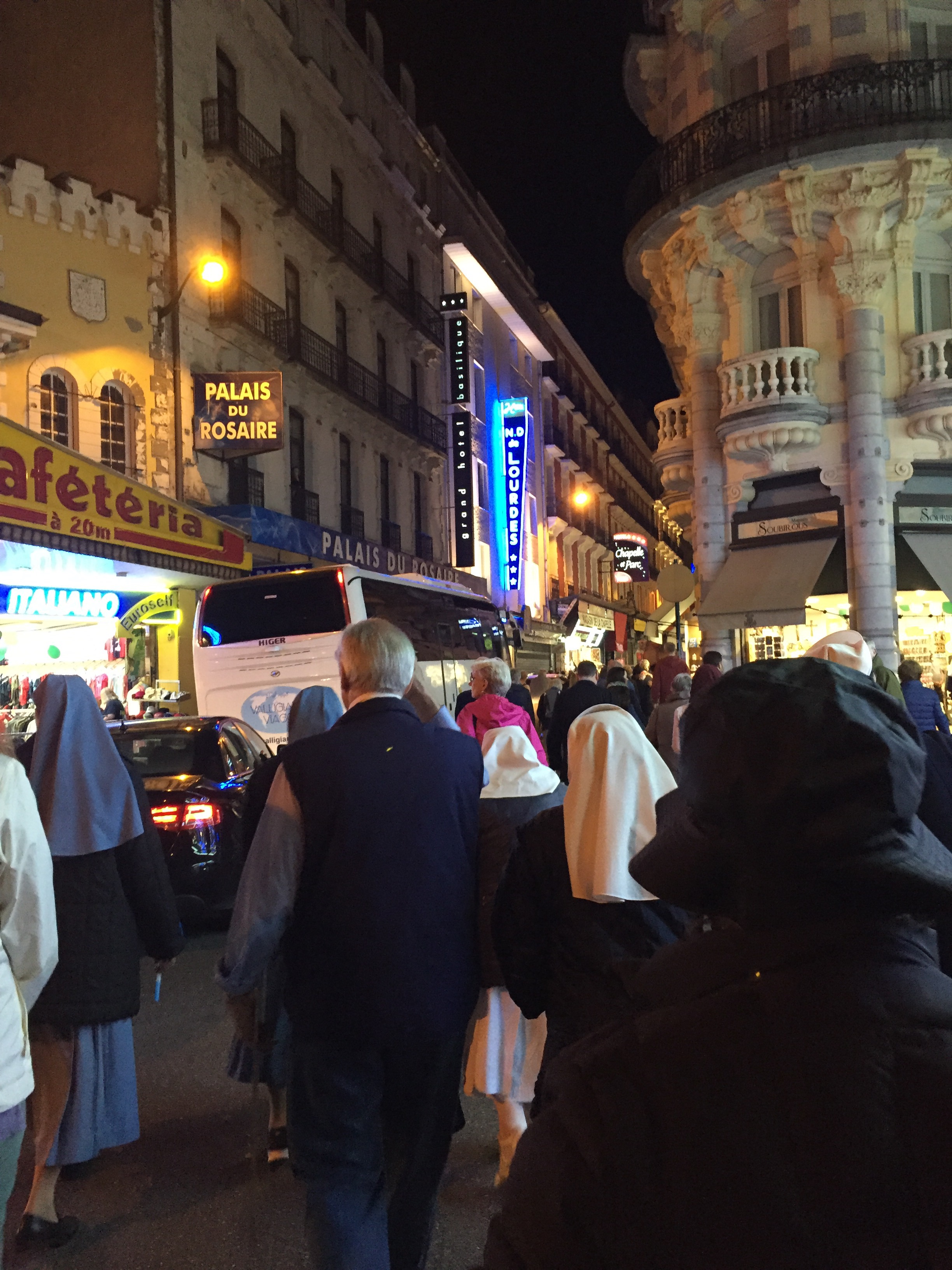 We caught up to my friend Adela. She had been thoughtful enough to buy a few extra candles and gave them to us so we were all set to head out for the candlelight procession. The streets were so packed that within minutes we had lost our group. Luckily my cousin Ed is so tall, I can always find him in a crowd. We were directed to the end of the line and after a short time the speakers came on and they started praying the rosary many different languages. There was one section of the crowd just for sick people. There are hundreds of wheelchairs, scooters and stretchers being guided along by nurses and volunteers. The crowd was so large I can’t even begin to guess how many thousands of people there were. Think of a professional football game kind of crowd.