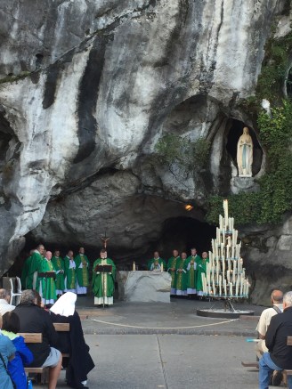 I think because there was so many people everywhere and the Lourdes is so packed with souvenir shops and buses, it didn’t seem to have the same little bit of magic feeling that Fatima had. Maybe because the procession was so large. Just being in a crowd that big is a little intimidating. We will have Mass at the Grotto where Our Lady appeared and then on to the baths. I’m hoping I can get a little more spirituality experience with doing the big dunk.