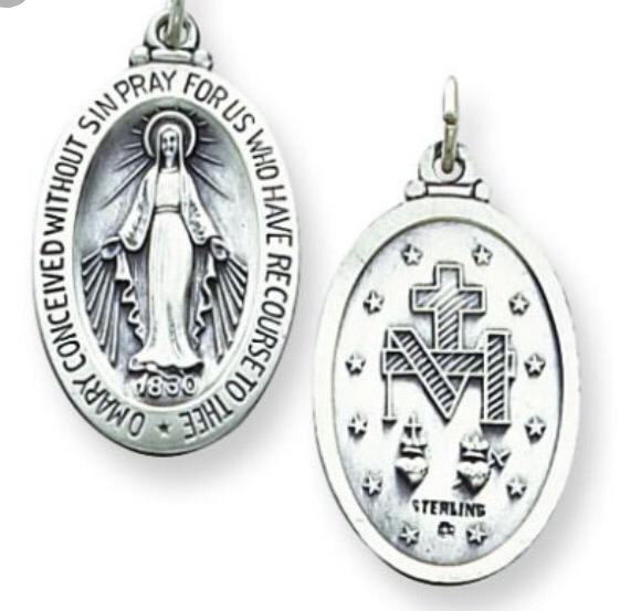 Catherine Labouré stated that on 19 July 1830, the eve of the feast of Saint Vincent de Paul, she woke up after hearing the voice of one child calling her to the chapel, where she heard the Virgin Mary say to her, “God wishes to charge you with a mission. You will be contradicted, but do not fear; you will have the grace to do what is necessary. Tell your spiritual director all that passes within you. Times are evil in France and in the world.” In 1830 Catherine reported that the Blessed Mother returned during evening meditations. She displayed herself inside an oval frame, standing upon a globe. She wore many rings set with gems[6] that shone rays of light over the globe. Around the margin of the frame appeared the words “O Mary, conceived without sin, pray for us who have recourse to thee”. As Catherine watched, the frame seemed to rotate, showing a circle of twelve stars, a large letter M surmounted by a cross, and the stylized Sacred Heart of Jesus crowned with thorns and Immaculate Heart of Mary pierced with a sword. Asked why some of the gems did not shed light, Mary reportedly replied, “Those are the graces for which people forget to ask.” Sister Catherine then heard the Virgin Mary ask her to take these images to her father confessor, telling him that they should be put on medallions, and saying “All who wear them will receive great graces.”[7]